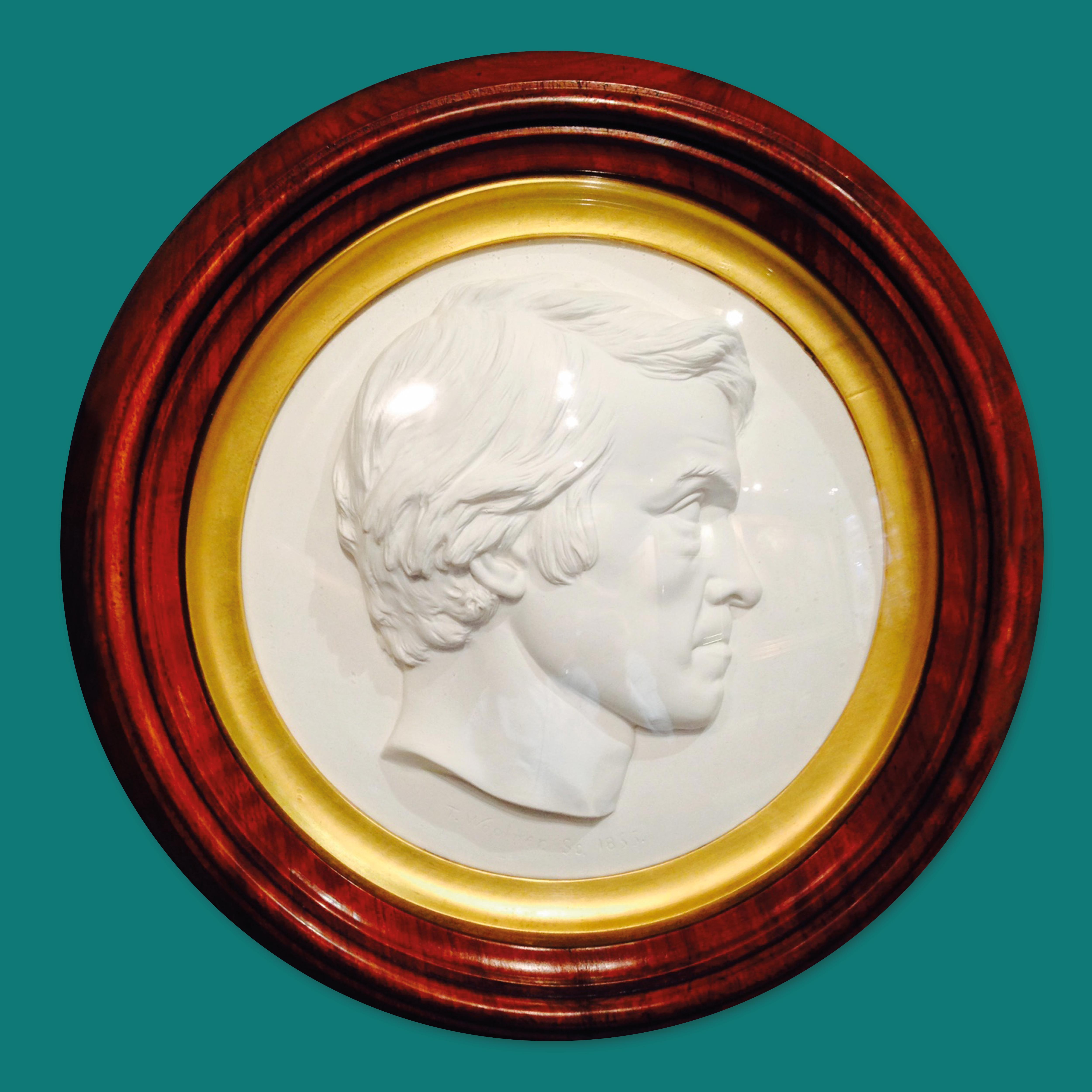 Woolner is recorded as working on two medallion portraits of Carlyle, the first in 1851, the second in 1855. The sittings were arranged for Woolner by the poet Coventry Patmore and in May 1851 Carlyle wrote to Woolner to tell him that “The Medallion is favourably hung up; and excites the approbation of a discerning public - as it deserves to do”. The second medallion of 1855 appears to be a re-working of the first and not taken from a second sitting from Carlyle, who by that time had grown a beard. In a letter to W Bell Scott in 1855 Woolner wrote : “I have made a new one of him (Tennyson), much better than the last; also a new Carlyle, better than the old one”. This present example, dated 1855, will be from this re-working. Woolner exhibited a “Medallion of Thomas Carlyle Esq.” at the Royal Academy in 1852, which can be assumed to be the 1851 work. In 1856 he again exhibited “Thomas Carlyle Esq.” , which can be assumed to be an example of his 1855 medallion. In 1857 at the RA he exhibits “Thomas Carlyle Esq. bronze medallion”, exhibiting a bronze medallion of Tennyson that same year.